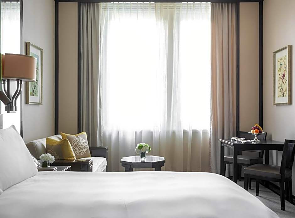 Room features views of Hong Kong's skyline and overlooks the hotel's courtyard and fountain.